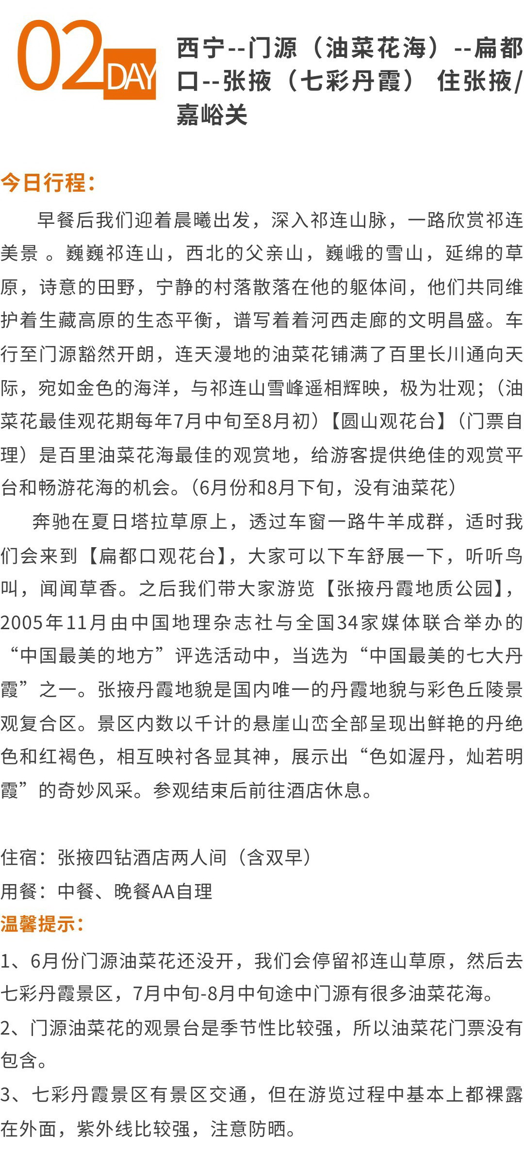 【其他费用门票】行程中的油菜花属于季节性观赏,故不含门源油菜花自理AA50元左右,茶卡盐湖小火车50(非必须)、翡翠湖小交通60(非必须)