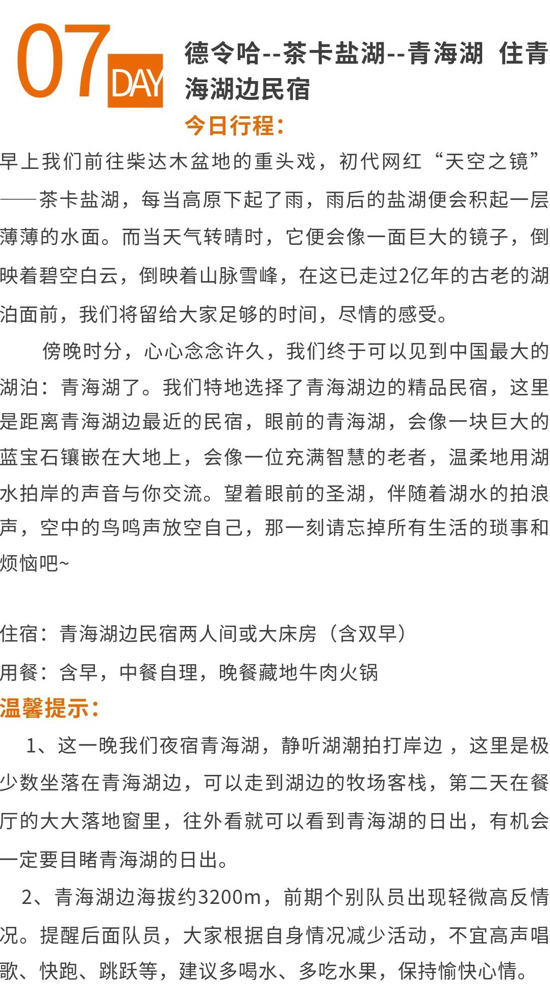 【关于用餐】 1. 我们认为饮食是最能体现当地文化的一部分,更希望队员能在旅途中自己去发掘当地的美食,这其中的快乐和魅力只有你自己尝试了才知道,而不是用团餐绑架了你的旅行,旅途中我们也会分享当地的美食供大家自由选择。 2. 并且每个人的饮食喜好和习惯不同,为了尊重每一个队员,我们可以选择一起聚餐或分开就餐,在这种情况下的就餐方式更为合适和灵活。 【住宿环境如何】 为我们特别注重每天的住宿环境能让你安逸的享受睡眠,全程所有的住宿都是经过我们认真踩点,精心考察安排,部分环境如大柴旦、青海湖住宿条件还是有限的,敬请见谅! 从环保及卫生考虑,请自备个人洗漱用品(毛巾、牙刷&牙膏、洗发露,沐浴液)。 【穿多少】
