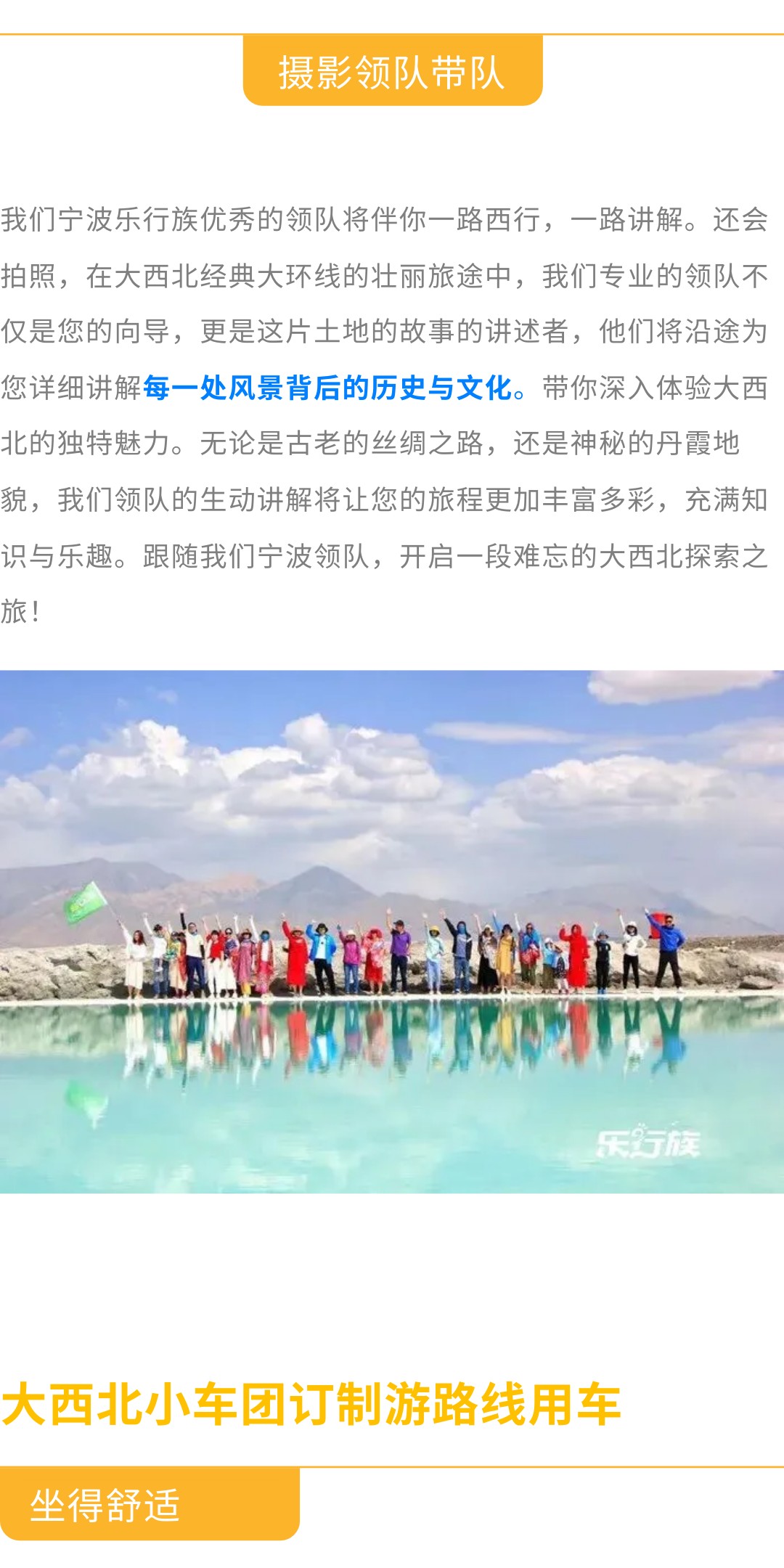 2、【领队】配备乐行族摄影领队,他们靠谱专业,一起进景区玩,会拍照,文艺2B,负责协调行程安排,组织分享与交流的平台,只为了让你的旅行满满真实和快乐的回忆。