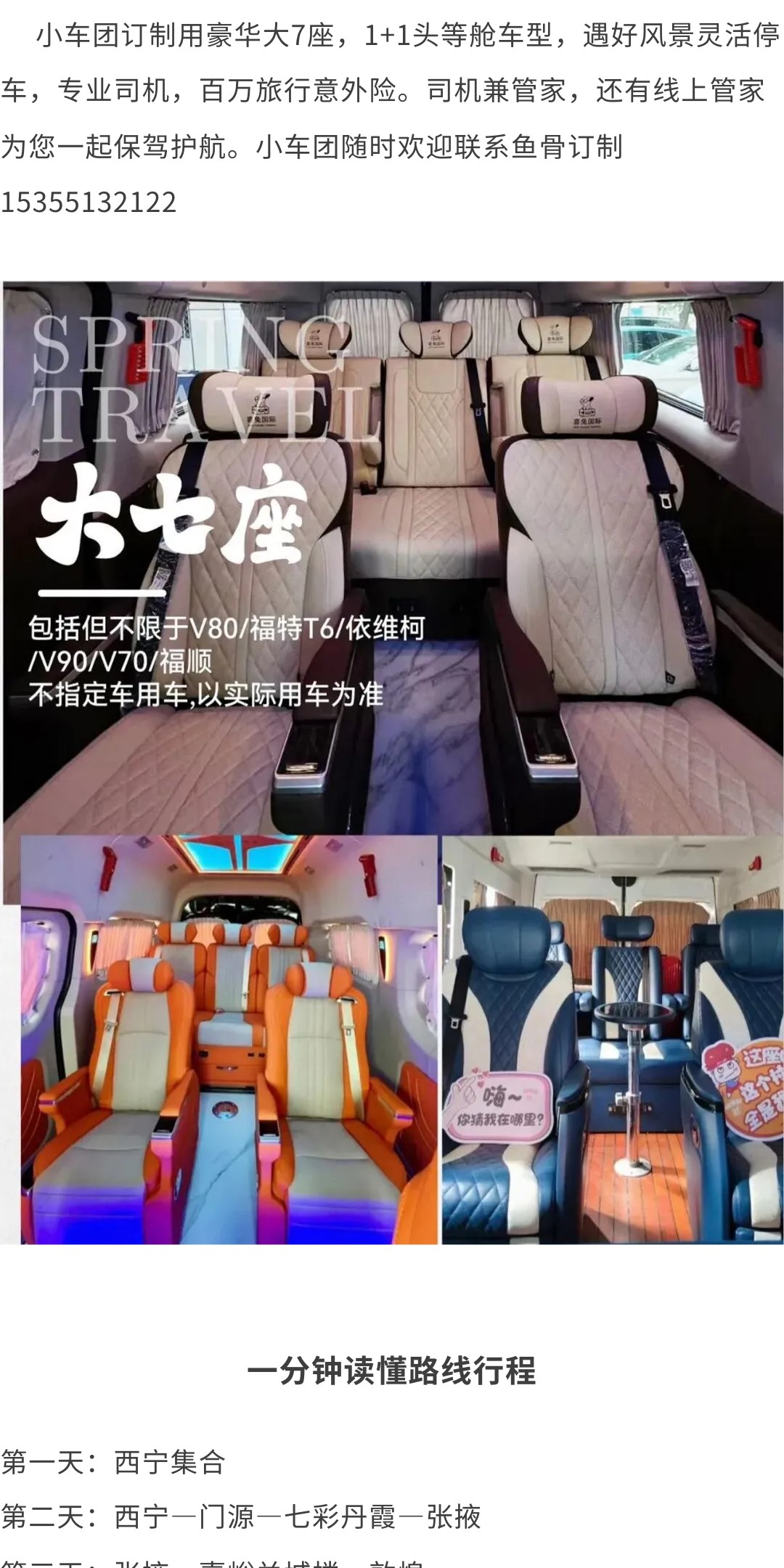 1、【交通】全程旅游用车的包车费用,同时包含每个座位的保险,全程路桥费,油费,司机食宿补贴。(15人以上自动升级成2+1保姆车)