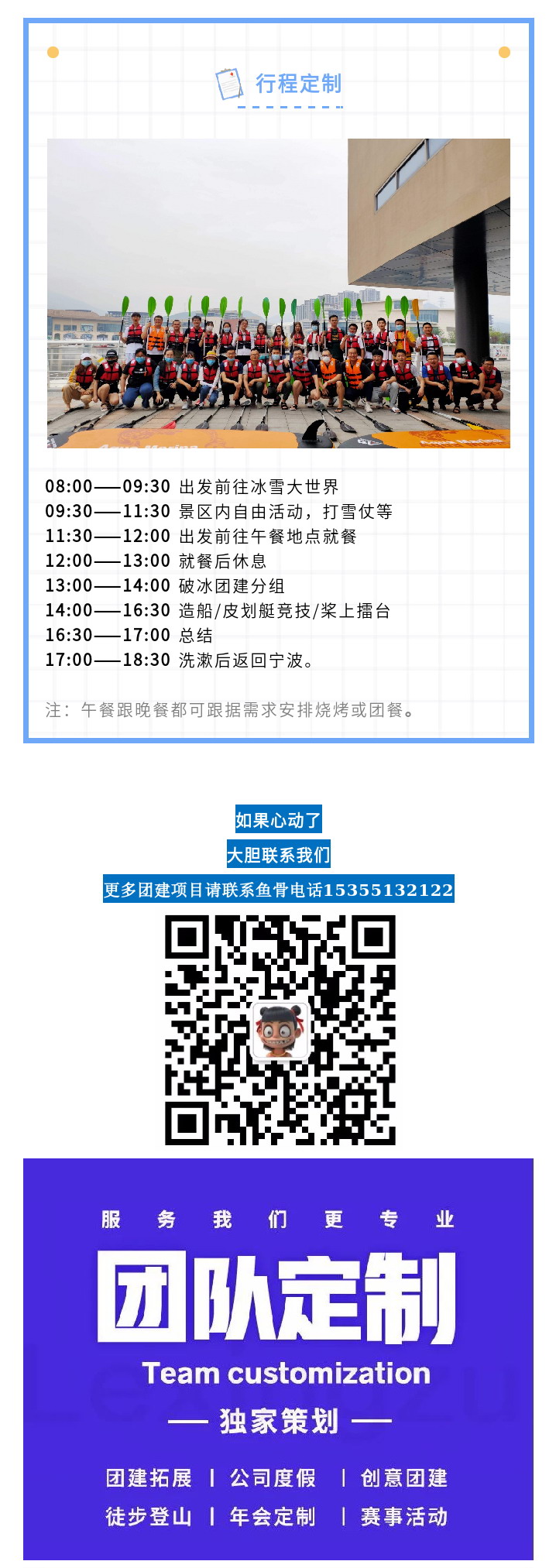 注:午餐跟晚餐都可跟据需求安排烧烤或团餐。