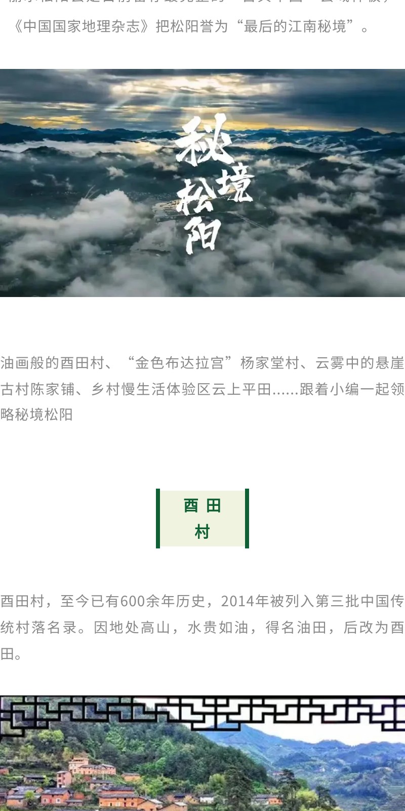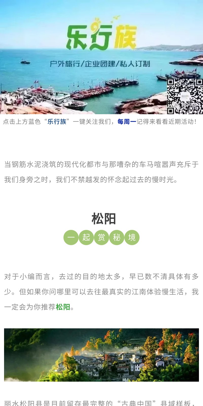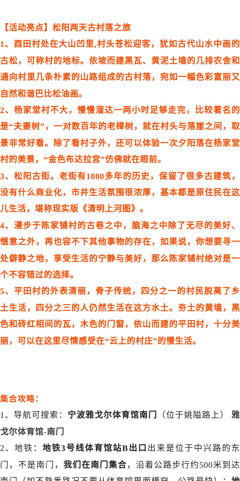 早餐后我们前往松阳【云上平田村】,这是被时间遗忘的古村落,也是松阳几个村落中海拔最高的村子,常年被水汽包围云雾缭绕,可以在此远观独山,感受孤独的烂漫。然后前往最出名的一个村子【陈家铺村】,感受着秘境中为数不多的文化气息,在网红先锋书店寻找寂静,在悬崖边的飞鸟集喝咖啡,感受落地窗外的云卷云舒。随后在村落内的农家乐享受当地美食,餐后,大概13:00左右集合返回宁波,路程大约4个半小时,预计回到宁波晚上17:30左右,大家意犹未尽,含泪吻别!期待下次一起开始的旅程!如果有兴趣把照片或者视频分享到我们的活动群里,如果被我们采纳发布在公众号里,会获得额外的积分奖励。