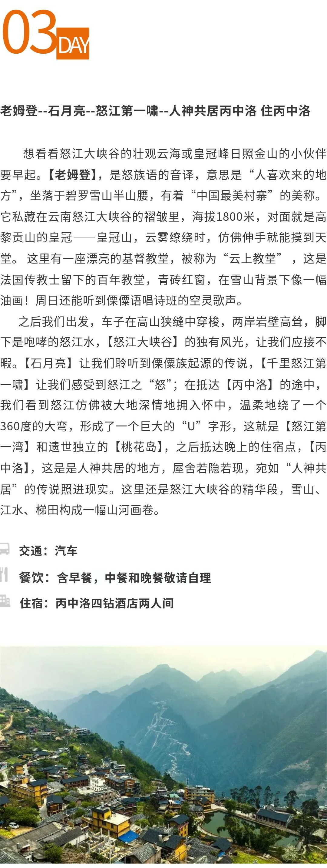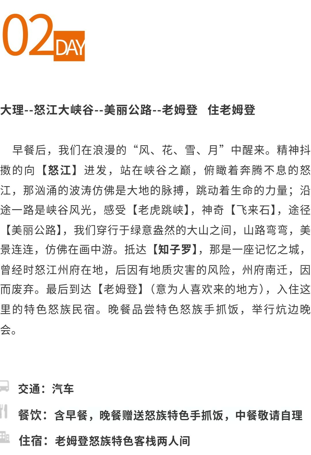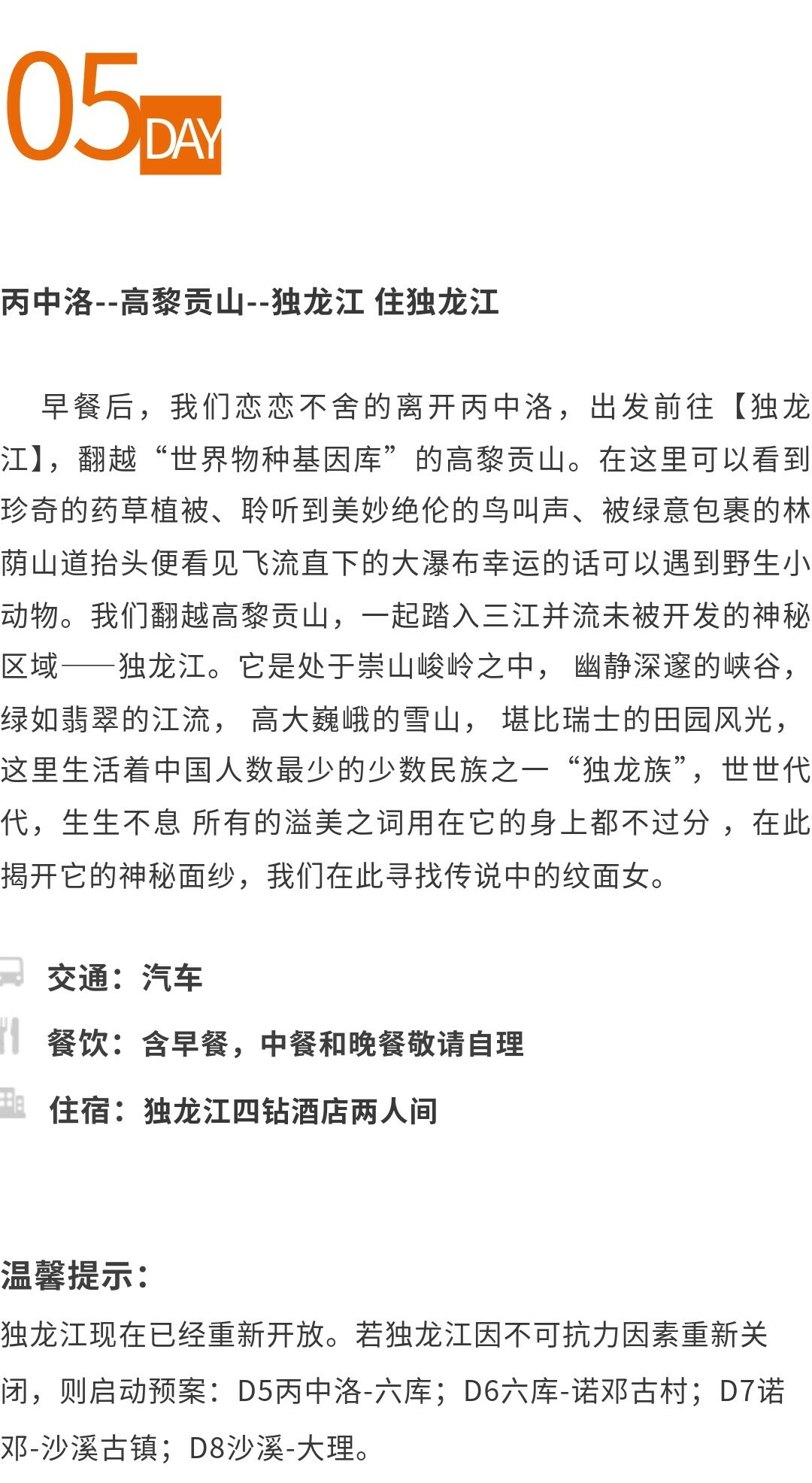 【费用包含】 1、【交通1】全程旅游用车的包车费用,同时包含每个座位的保险,全程路桥费,油费,司机食宿补贴。 2、【交通2】丙中洛换小车费用+独龙江换小车费用 3、【领队】至少一名宁波乐行族专业的随团工作人员全程陪同,他们靠谱专业,会拍照,负责协调行程安排,组织分享与交流的平台,只为了让你的旅行满满真实和快乐的回忆。 4、【住宿】大理四钻酒店两人间1晚,老姆登怒族特色客栈两人间1晚,丙中洛四钻酒店两人间2晚,独龙江四钻酒店两人间 1晚,福贡县城三钻酒店两人间1晚,六库四钻酒店两人间1晚(全程含双早) 5、【门票】怒江溜索体验门票 6、【组织】长线组织成本费 7、【用餐】含早餐,赠送老姆登怒族特色手抓饭、炕边晚会 8、【物资】公共物资,急救包(创口贴、消毒碘伏、云南白药喷雾等,口服药和特殊药物请根据自身情况提前自备) 儿童价说明:(儿童是指15米以下,只含车费、领队费、赠送保险,不占床不含早餐劵和景交索道、门票根据身高现场补收) 特殊提醒:请家长为没有身份证的孩子携带好学生证或户口本,部分景区儿童1.2米以下免门票,1.2-1.5米的儿童有学生证部分景区有优惠价。其他人有优惠证件都可以带上,在领队买票之前主动出示证件。具体以景区公告为准。 【赠送】 2、充气U型枕、眼罩 3、【保险】乐行族旅行社责任险+50万个人意外险 4、两人以上同一个航班赠送接机