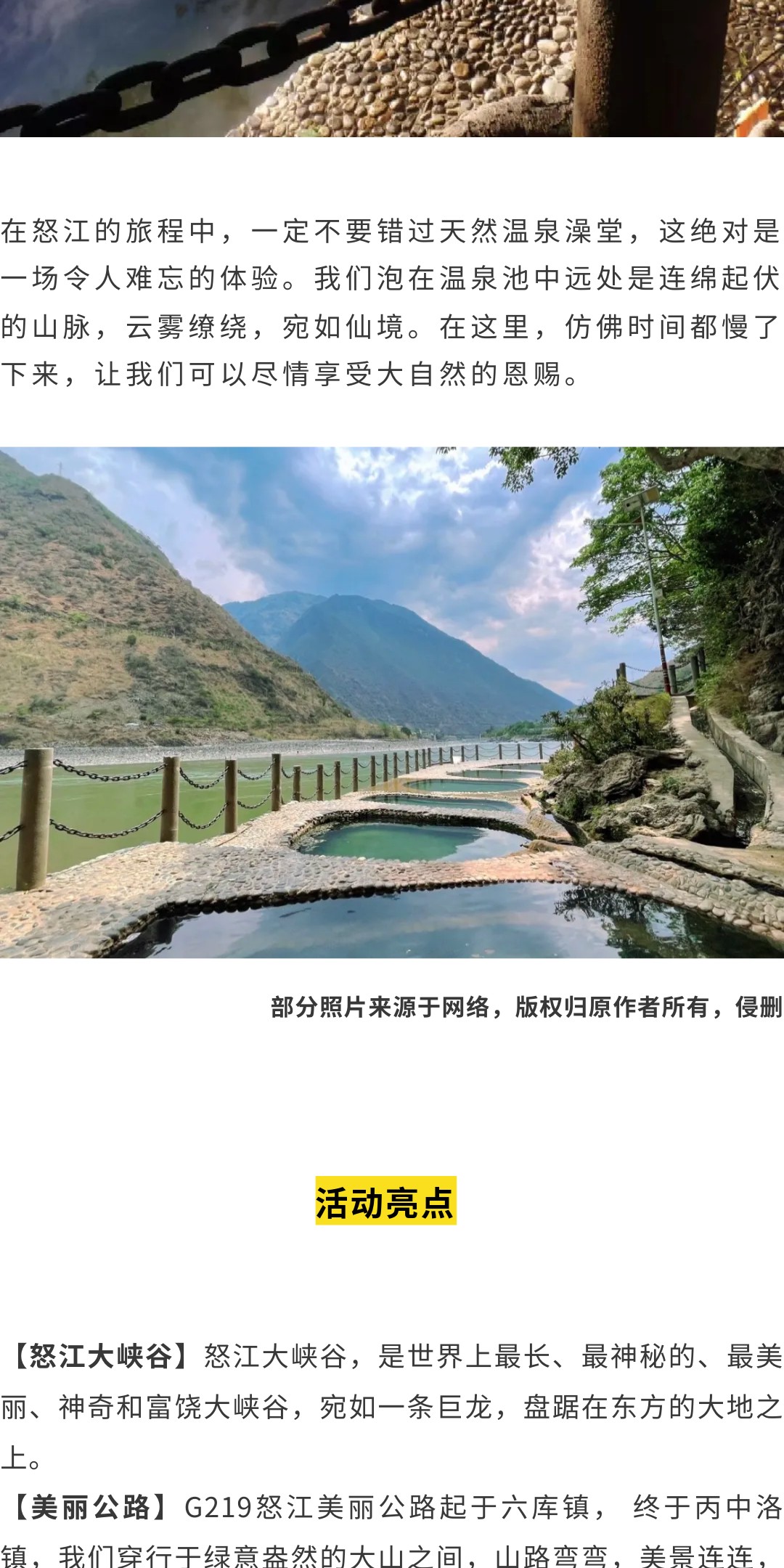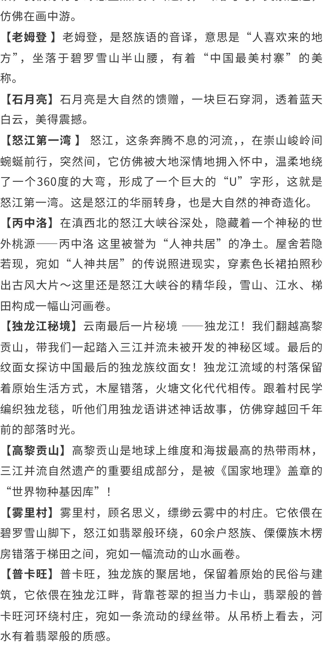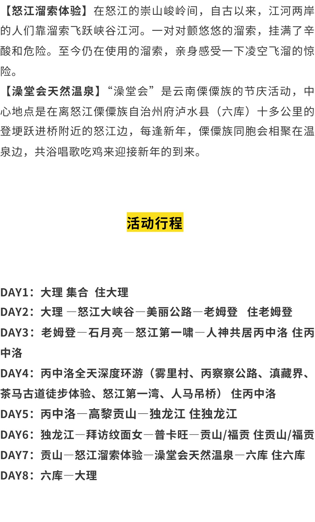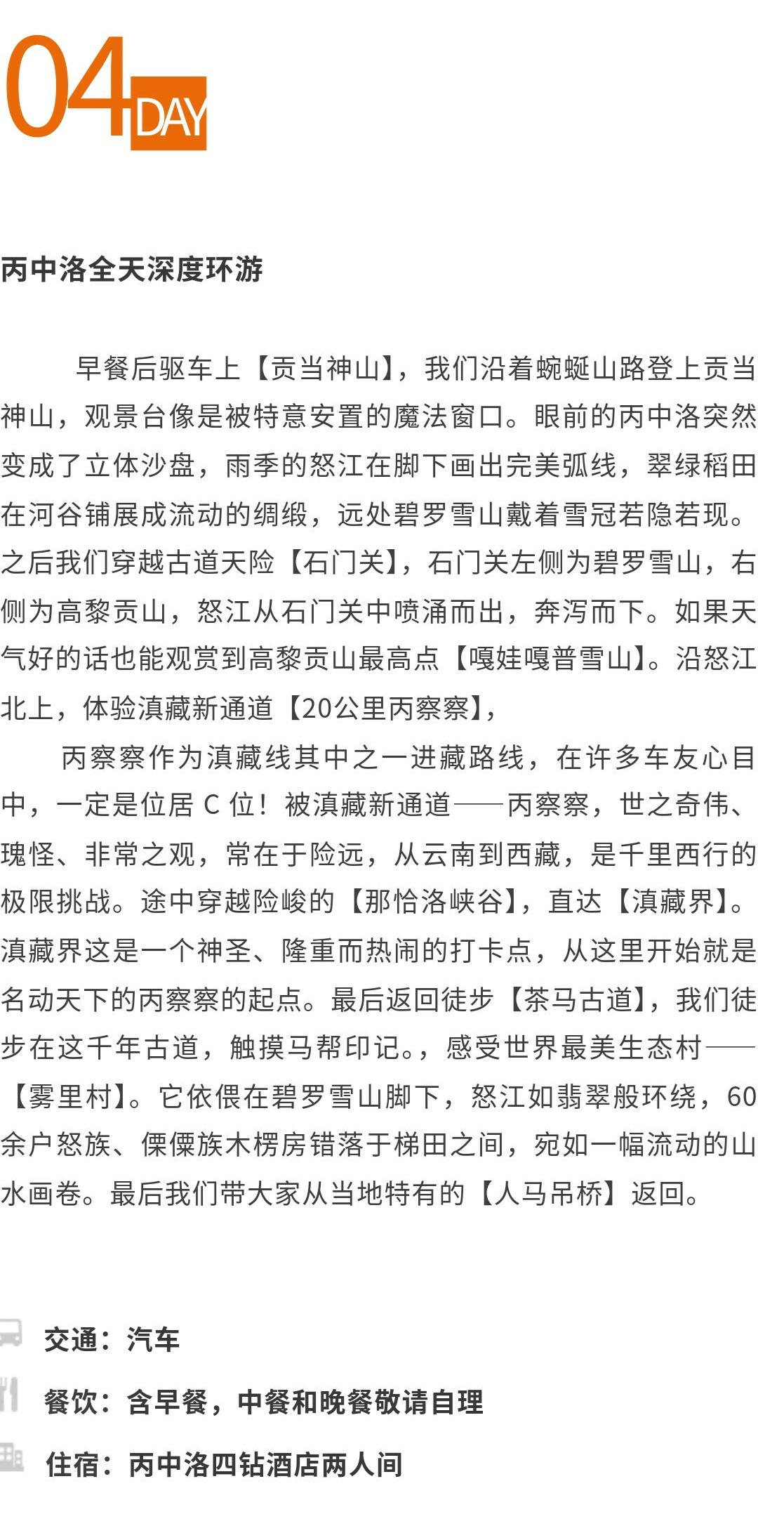 【费用包含】 1、【交通1】全程旅游用车的包车费用,同时包含每个座位的保险,全程路桥费,油费,司机食宿补贴。 2、【交通2】丙中洛换小车费用+独龙江换小车费用 3、【领队】至少一名宁波乐行族专业的随团工作人员全程陪同,他们靠谱专业,会拍照,负责协调行程安排,组织分享与交流的平台,只为了让你的旅行满满真实和快乐的回忆。 4、【住宿】大理四钻酒店两人间1晚,老姆登怒族特色客栈两人间1晚,丙中洛四钻酒店两人间2晚,独龙江四钻酒店两人间 1晚,福贡县城三钻酒店两人间1晚,六库四钻酒店两人间1晚(全程含双早) 5、【门票】怒江溜索体验门票 6、【组织】长线组织成本费 7、【用餐】含早餐,赠送老姆登怒族特色手抓饭、炕边晚会 8、【物资】公共物资,急救包(创口贴、消毒碘伏、云南白药喷雾等,口服药和特殊药物请根据自身情况提前自备) 儿童价说明:(儿童是指15米以下,只含车费、领队费、赠送保险,不占床不含早餐劵和景交索道、门票根据身高现场补收) 特殊提醒:请家长为没有身份证的孩子携带好学生证或户口本,部分景区儿童1.2米以下免门票,1.2-1.5米的儿童有学生证部分景区有优惠价。其他人有优惠证件都可以带上,在领队买票之前主动出示证件。具体以景区公告为准。 【赠送】 2、充气U型枕、眼罩 3、【保险】乐行族旅行社责任险+50万个人意外险 4、两人以上同一个航班赠送接机