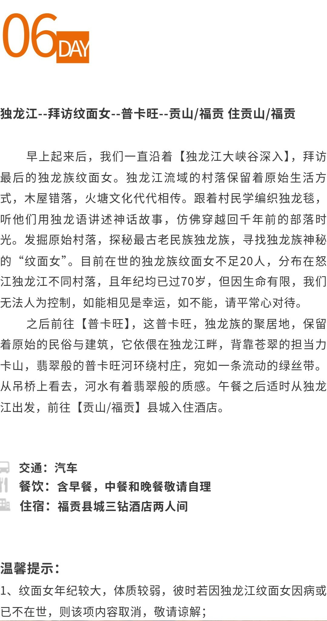 【注意事项】 1、参加者须身体健康; 2、必须有环保意识与团队协作精神; 3、为了您的安全必须服从领队安排; 4、违反行程安排,造成人员及其他意外,个人负全部责任,组织方保留其追究法律责任的权利; 5、若因不可抗力因素(堵车、坏车、暴风雨等)导致行程阻断,本公司及领队有权另做其它相应行程安排; 6、强烈建议穿徒步鞋或者运动鞋;有必要之余也建议带一双拖鞋或凉鞋; 7、带拉杆箱的朋友要单独带一个小包,方便徒步的时候带补给物资和必备物品,大行李徒步的时候就放车; 8、预防水土不服,请携带一些常用药品,如:白加黑,创可帖,氟哌酸等; 9、消毒湿纸巾会让出行更方便; 10、有些不方便找自动提款机,备些现金放在身上; 11、如果参加者饮食方面有忌口请自备零食; 12、如果有个人习惯要求的队员请自带一些个人用品(酒店是备有有毛巾浴巾、洗浴品、WiFi、空调、烧水壶,拖鞋等。酒店标准双人床一般是1米2的床); 14、请带好雨伞、防晒霜、润肤霜、帽子、墨镜等,穿衣可以卫衣,外套,薄长袖都带上,夜晚温度偏低的时候可以披外套; 【吃什么】 1.我们认为饮食是最能体现当地文化的一部分,更希望队员能在旅途中自己去发掘当地的美食,这其中的快乐和魅力只有你自己尝试了才知道,而不是用团餐绑架了你的旅行,旅途中我们也会分享当地的美食供大家自由选择。 2. 每个人的饮食喜好和习惯不同,为了尊重每一个队员,我们可以选择一起聚餐或分开就餐,更为合适和灵活。 【住宿环境如何】 我们特别注重每天的住宿环境,为了能让你安逸的享受睡眠,全程所有的住宿我们都尽量安排了当地硬件靠前的优质酒店,酒店周围环境很好。从环保及卫生考虑,请自备个人洗漱用品(毛巾、牙刷&牙膏、洗发露,沐浴液、拖鞋等)虽然酒店有。 【穿什么】 推荐您的标准搭配: 衣服:快干衣、短袖、长袖、薄外套、裙子 裤子:宽松的休闲裤适宜 鞋子:1至2双 以运动、休闲鞋最佳,另外带一双拖鞋。 【带什么】 1、雨具带上,帽子、光源、太阳镜、防晒霜、润唇膏、个人洗漱用品、相机、充电宝、手电。 2、行李箱+背包一个20升左右最好或者小包 3、带保温杯(可以喝到热水) 4、自带感冒药、肠胃药、晕车药等个人常用药品 5、身份证,部分现金(带些现金以备不时之需,500元左右就足够了) 关于安全告知: 【观光游览安全注意事项】 1.听取随团工作人员有关安全的提示。 2.参与活动时请结合自身身体的健康状况,避免过度透支体力,注意适当休息。 3.在游览时请注意看脚下的路,经过危险地段时(如陡峭/狭窄/湿滑的道路),请务必谨慎慢行。 4.尽量结伴游览,如果游览过程中迷路或与队伍走散,请保持冷静,尽量在原地或有显著标志的地方等候,打电话给随团工作人员寻求帮助。 5.拍照:请不要随意停下来拍照,切忌边走边拍,以避免脚滑受伤、财物损失等。 6.蛇虫危险:在行走过程中请尽量穿长袖长裤,避免蚊虫叮咬。如遇蛇虫,请勿惊慌,小心行走,避免与蛇虫正面冲突。 【自由活动/自费活动安全告知】 1.自由活动、参加自费活动时,请注意人身安全和财物安全。 2.参加自费活动时,充分了解活动的内容、设备设施的性能并严格遵守活动项目的安全规定,请选择有资质、有保险、专业人员伴随的公司,并建议大家主动购买相关保险。 3.自由活动期间,如前往购物时,请注意商品质量及价格,应细心鉴别商品真伪并向商家索取正式发票。无意购买时,请勿向商家问价或者还价,以免发生不必要的争执。 4.自由活动期间须遵守当地的法律法规及风俗习惯。 因目的地发生不可抗力:【不可抗力】