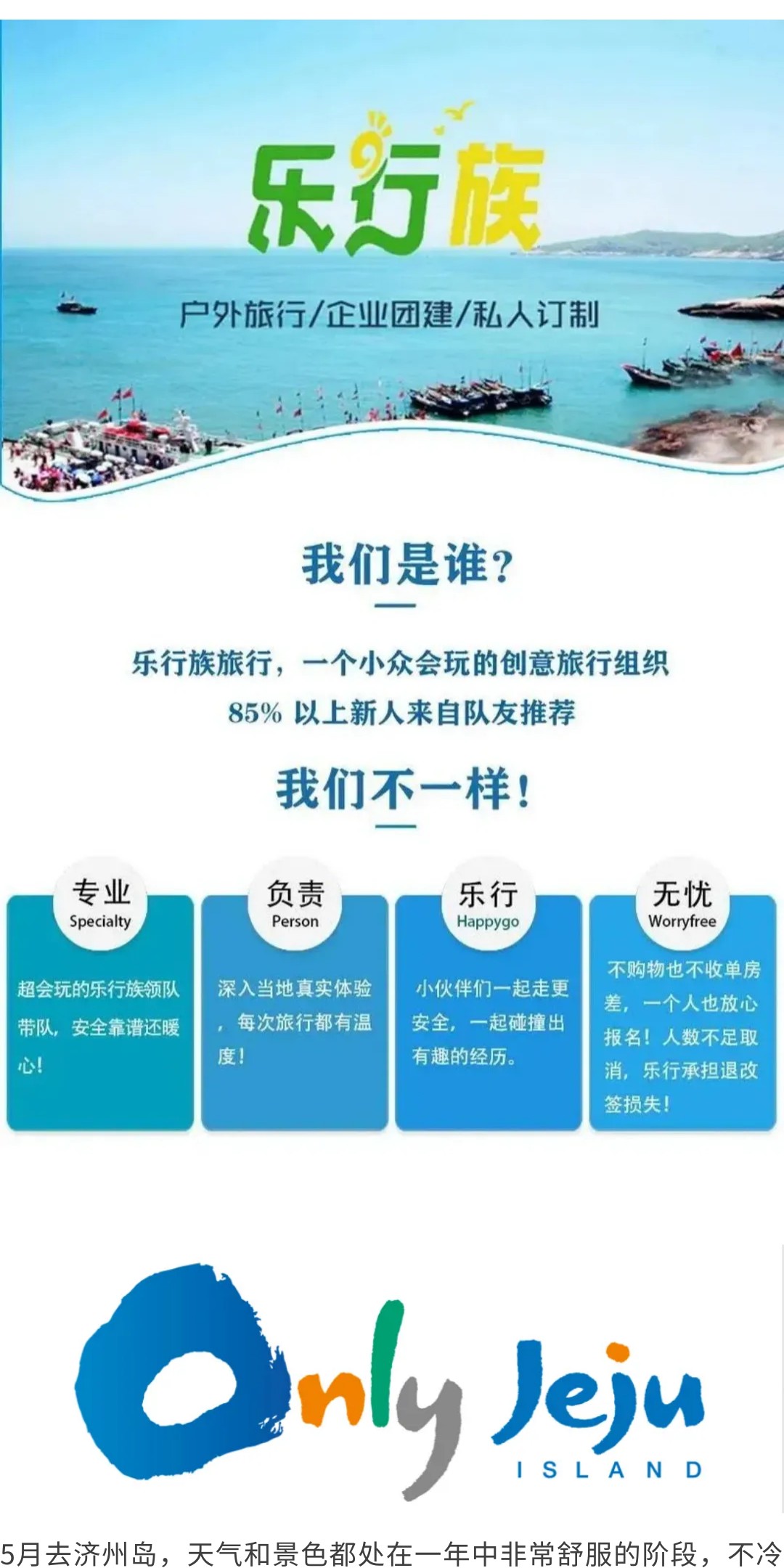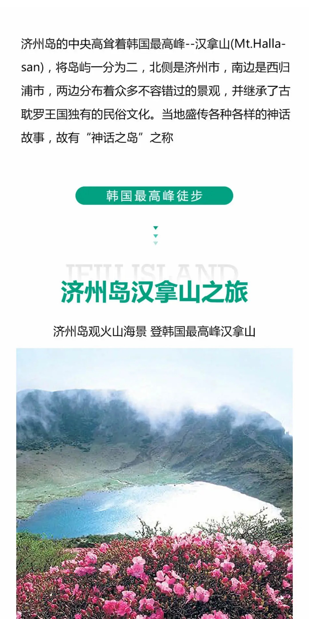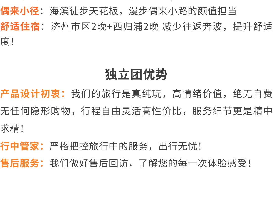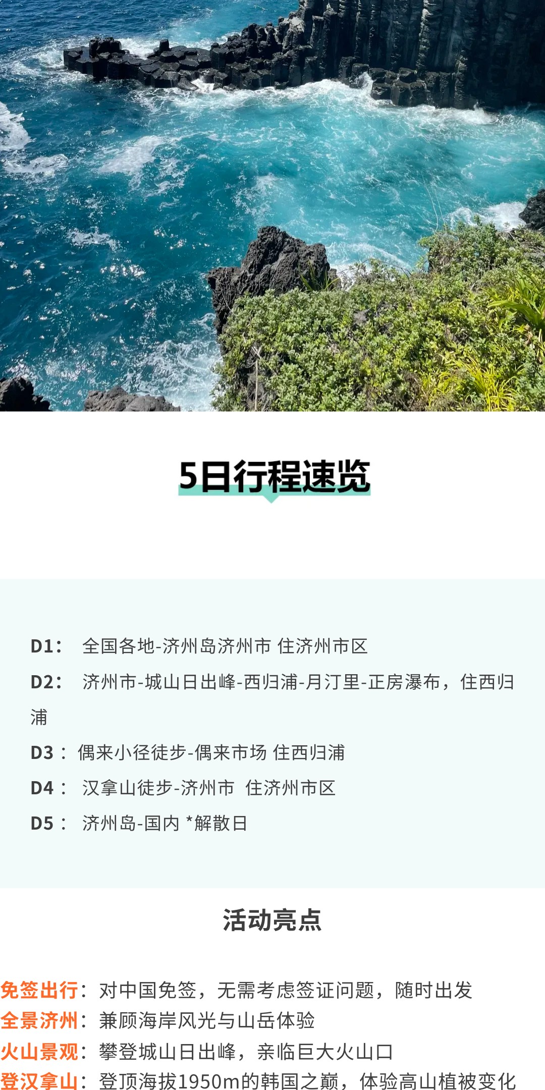 【交通】:当地用车(正规运营资质车队) 【住宿】:优选经济型住宿4晚 D1/D4:济州岛市区酒店 D2/D3:西归浦酒店 【门票】:行程内所有景区门票正房瀑布门票、城山日出峰门票 【体验活动】:偶来小路徒步活动+城山日出峰登山活动 【随团服务人员】:乐行族摄影陪同+境外司机 【赠送】 1、50万个人出境旅游意外险